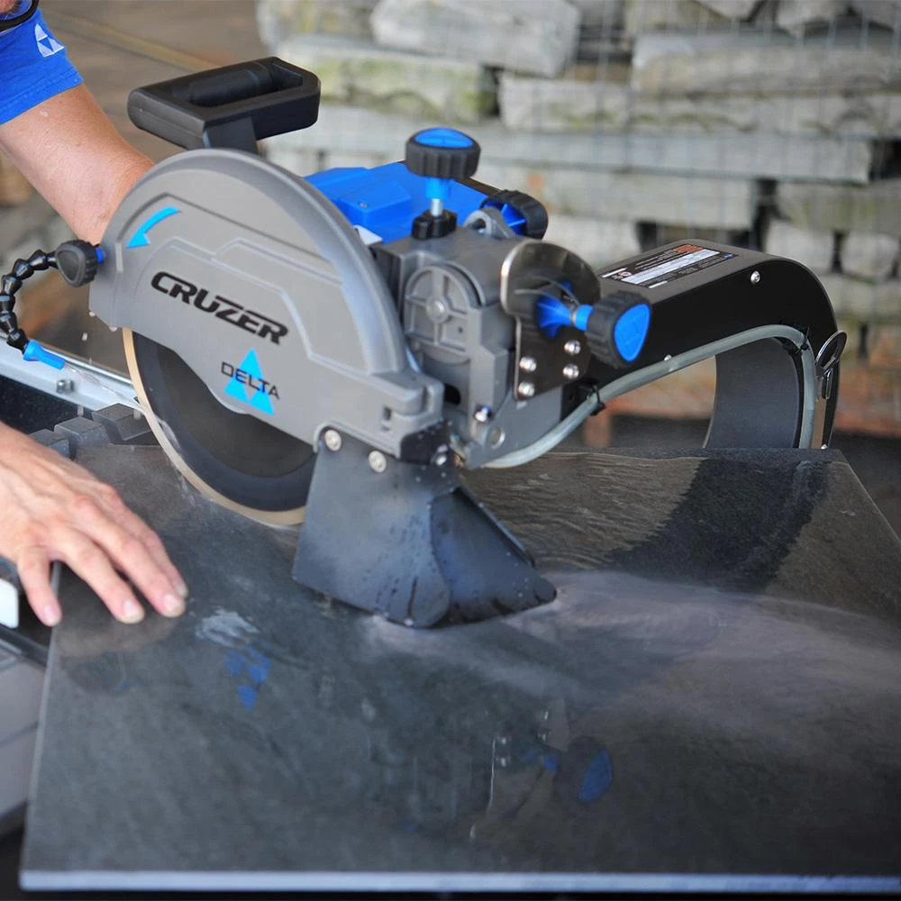Get powerful, professional results with this Delta Cruzer 10 in. Wet Tile Saw. Its 15 amp motor cuts through natural and man-made stone, tile and pavers. The diamond cutting wheel handles stone up to 3-3/8 in. thick and delivers a best-in-class rip capacity of 34 in. and an 24 in. diagonal cut capacity. The saw is constructed using a heavy-duty rail system with 12 bearings that’s engineered for smooth, straight and accurate cuts. Adjust the dual water nozzles for optimal water placement on the blade to minimize over-spray and keep the blade cool for superior cutting performance. The saw includes a stand that sets up and folds down with a foot-actuated pedal, making it easy to transport from location to location.